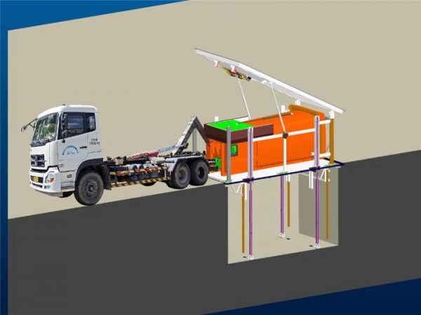 只要將地埋式垃圾箱上蓋打開,垃圾箱的推頭就會把推頭室的垃圾推到垃圾貯料倉從而達到垃圾壓縮功能。
